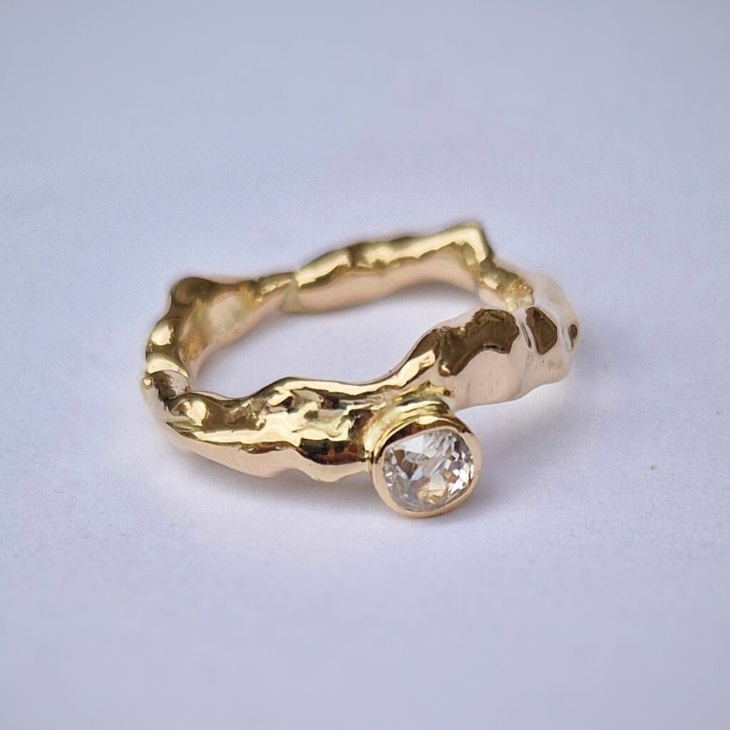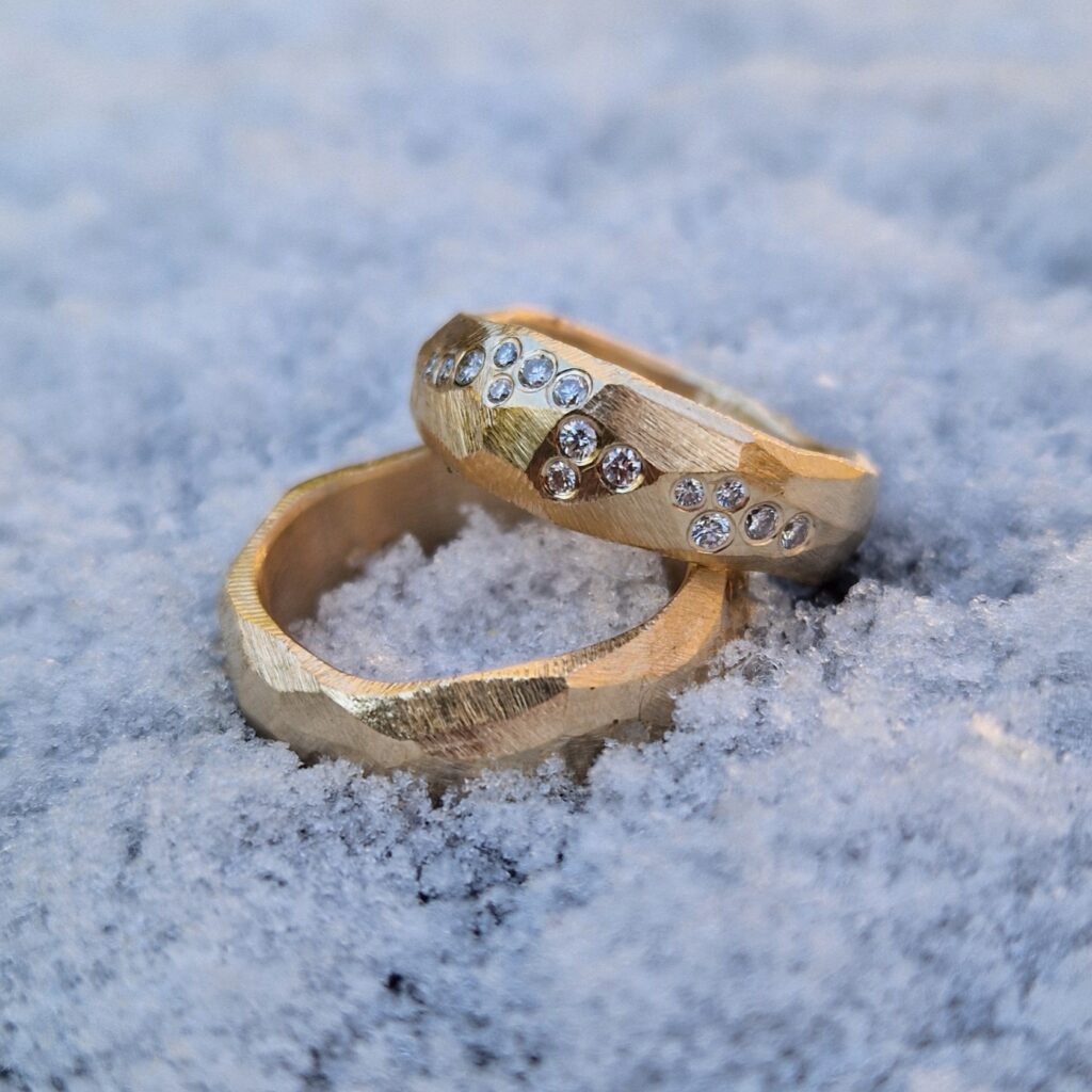 På billederne herunder kan du se et eksempel på hvordan kunders gamle guld er blevet forvandlet til nye personlige og unikke designs. Men mulighederne er mange flere! Begynd med at tænke over hvilken stil og hvilket udtryk du ønsker dig. Skal det være stramt og enkelt, skal det være bløde organiske former, eller skal det være helt råt i udtrykket? Når du har gjort dig dine første tanker, er du velkommen til at komme forbi guldsmedeværkstedet på Østerbro til et designmøde. Her vil Dina hjælpe dig på vej med at finde det helt præcise udtryk i dit nye drømmesmykke.